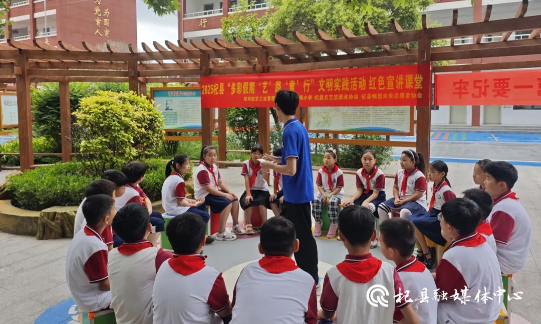 7月23日,由县新时代文明实践中心、县教育体育局、县文联、团县委组织,郑州航空工业管理学院党委宣传部星火燎原实践团、县文艺志愿者协会、县畅想未来志愿者协会及多所院校返乡大学生、大同小学100多名小学生共同参与的2025杞县“多彩假期‘艺’路‘童’行”文明实践活动在大同小学举行。